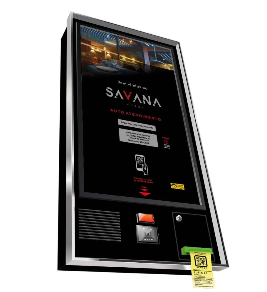 O AVT-430 é um totem de autoatendimento de última geração, equipado com voz eletrônica realista e tela Touch 4K de 43”, oferecendo imagens em altíssima definição e informações completas sobre categorias, suítes disponíveis, opções em espera, recursos e tabela de preços, tudo sincronizado em tempo real com o software de gestão. Pensado para elevar a experiência do hóspede e otimizar a operação, o sistema ainda conta com um espaço exclusivo para a exibição de anúncios e promoções personalizadas, gerando novas oportunidades de receita. A integração com plataformas de reserva, como o Guia de Motéis, permite a identificação do hóspede via CPF digitado ou QR Code gerado diretamente pelo celular, proporcionando praticidade, segurança e autonomia no processo de check-in.